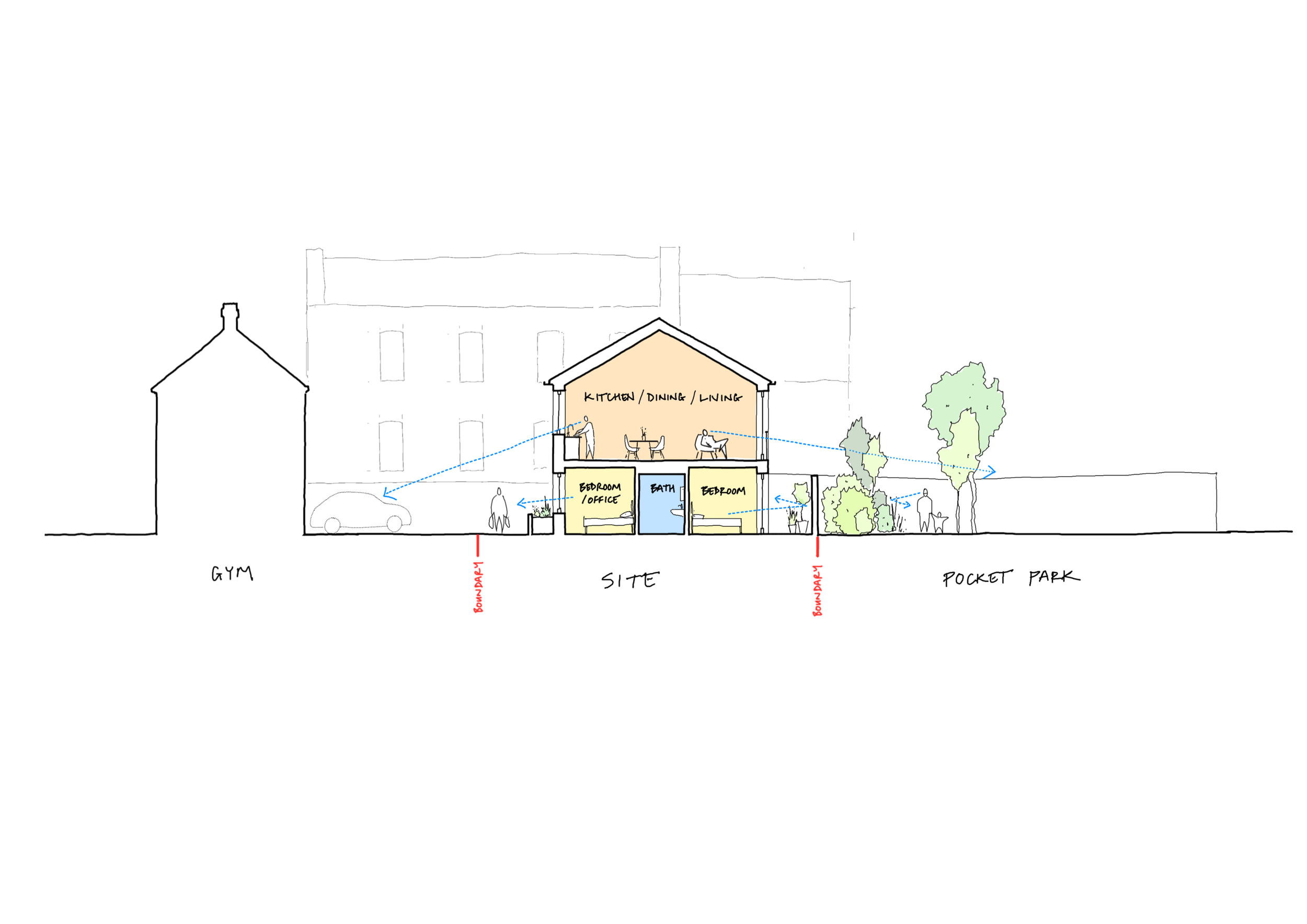 The private realms of the dwellings, principally the bedrooms were located on the ground floor, which opened onto a landscaped courtyard garden. These outdoor spaces serve a dual function: they offer privacy and tranquillity while also acting as light wells to the lower levels, mitigating the potential for overshadowing on a compact site.